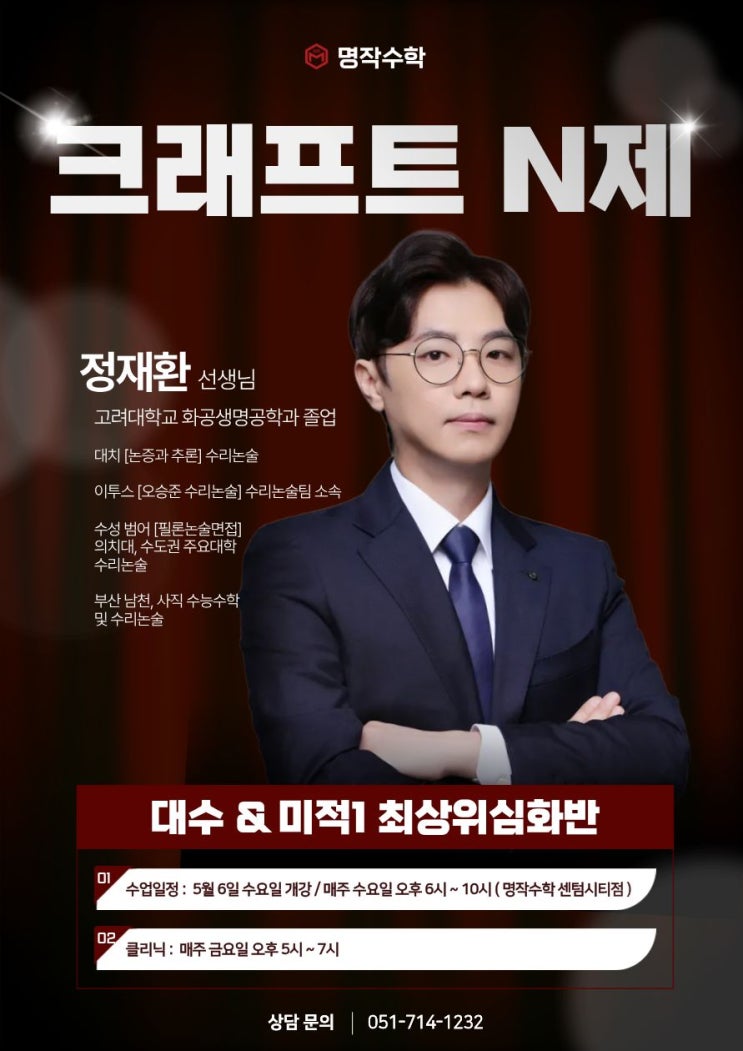 안녕하세요 명작수학 센텀시티점입니다. 신규 강사진 정재환T의 [크래프트 N제] 반이 개강되었습니다. 많은 관심 부탁드립니다. 감사합니다. [강사 소개 및 수업 로드맵 안내] ※ 1차 가오픈 수업(무료) 4/22(수) 오후 6시 ~ 8시30분 (명작수학 센텀시티점) ※ 2차 가오픈 수업(무료) 4/29(수) 오후 6시 ~ 8시30분 (명작수학 센텀시티점) ■ 개강일 : 5/6(수) ■ 수업일시 : 매주 수요일 오후 6시 ~ 10시 (명작수학 센텀시티점) ■ 클리닉 : 매주 금요일 오후 5시 ~ 7시 (명작스터디카페) ■ 수업정보 : 중등 선행대상 / 최상위심화 대수, 미적1 문제풀이반 ■ 강사명 : 정재환T ▼신청링크▼ https://naver.me/F1aF0r9N <img src="https://blogthumb.pstatic.net/MjAyNjA0MjBfMjkz/MDAxNzc2Njg2NTQzODE2.euvkrZ1jzwMg1JbUkFTUEeTmx0M-O-jYiWdlXTzLW18g.c-oZmcQajPN_dRFB7n_0GCvKCAHPKnQd416YazRF3BYg.JPEG/%C1%A4%C0%E7%C8%AFT_%C5%A9%B7%A1%C7%C1%C6%AEN%C1%A6.jpg?type=s3" />